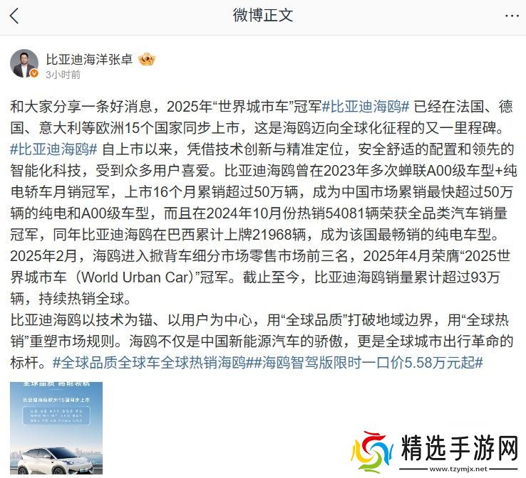 本站 5 月 25 日消息,比亚迪汽车海洋网销售事业部总经理张卓今日发文分享:2025 年“世界城市车”冠军比亚迪海鸥已经在法国、德国、意大利等欧洲 15 个国家同步上市。他表示,这是海鸥迈向全球化征程的又一里程碑。