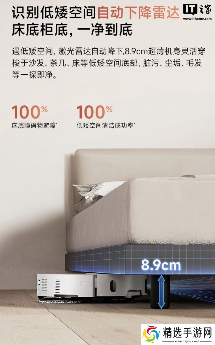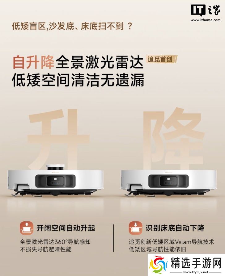 此外,该机器人配备自升降全景激光雷达,可以识别床底自动下降,避免出现家具易碰撞卡顿情况。