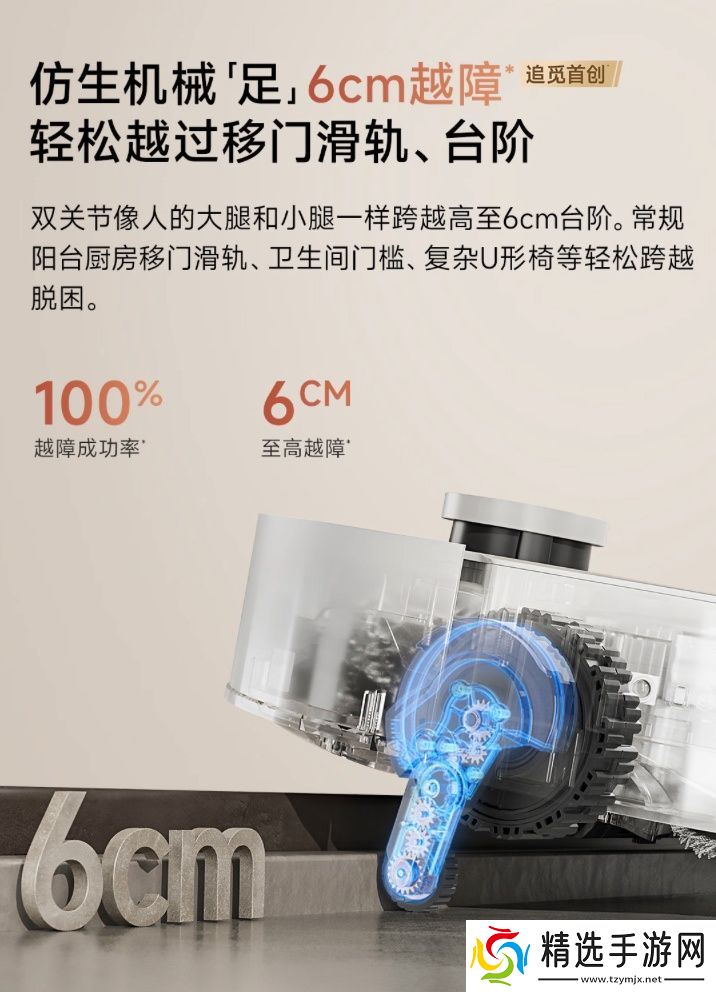 该机器人配备仿生机械足,号称可以像人的大腿和小腿一样跨越高6cm台阶,可以跨越阳台厨房移门滑轨、卫生间门槛、U 形椅等场景。