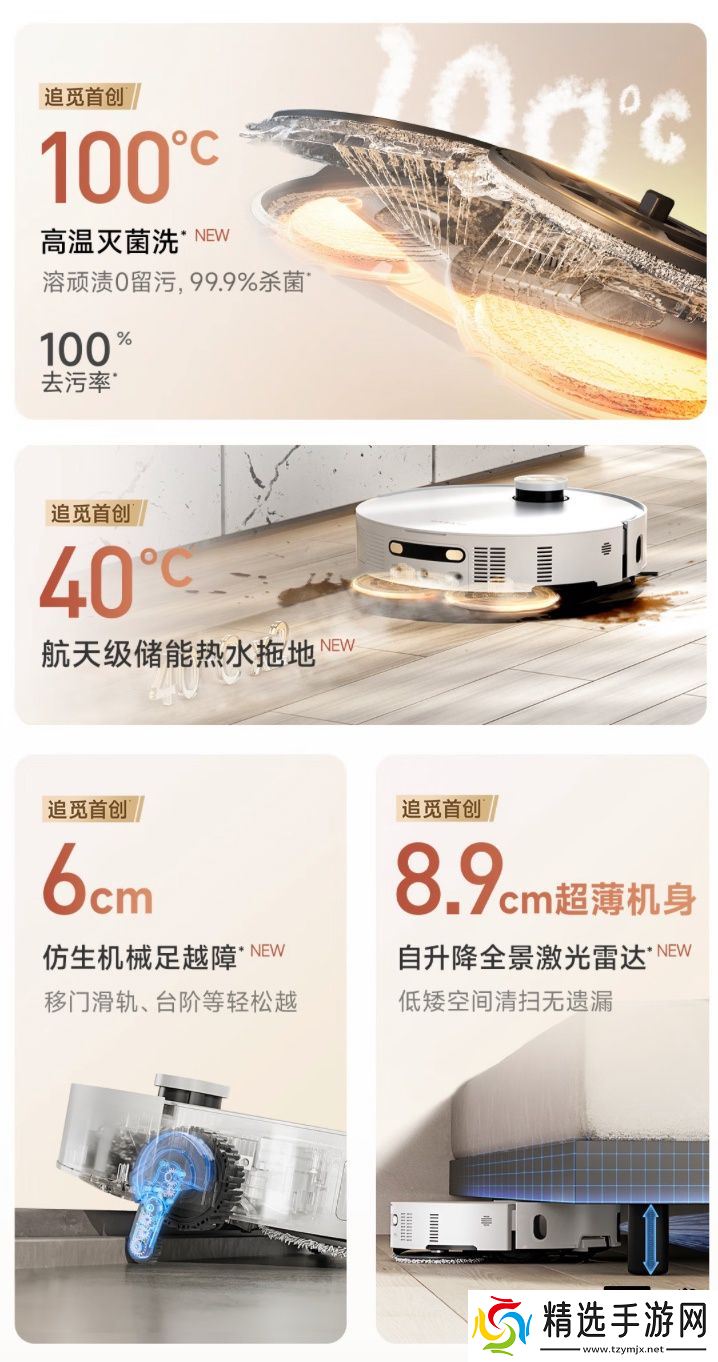 这款扫拖机器人拥有24000Pa吸力,配备100度高温灭菌洗拖布和基站清洗盘,配备“0 缠毛双滚刷”,同时支持40度热水拖地,号称可以有效溶解厨房、餐厅等重油重污。