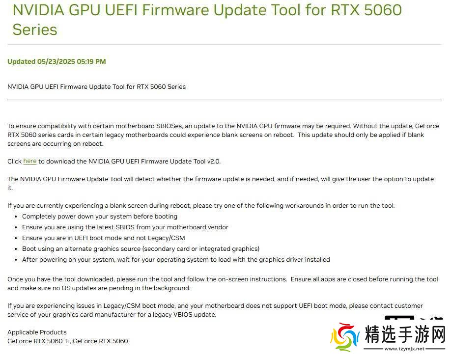 • 英伟达近日发布了一项重要更新,旨在解决RTX 5060系列显卡在部分用户设备中出现的黑屏与重启问题。此次更新以UEFI固件更新工具v2.0的形式推出,并于当地时间23日正式公告。