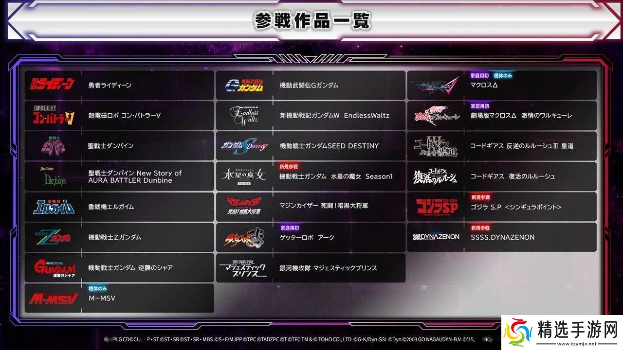 此次公布的参战作品名单中,包含了21部经典动画作品,如《超力电磁侠》、《**士丹拜因》、《机动武斗传G高达》等。这些作品中的机器人角色都将以全新的姿态出现在游戏中,为玩家带来全新的游戏体验。游戏还公布了由JAM Project演唱的主题曲「反撃 Fight Back!」,为游戏增添了更多的激情与活力。