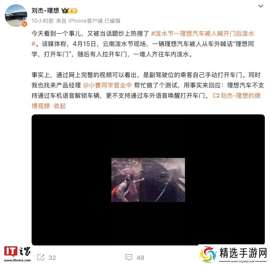 本站 4 月 18 日消息,近期,网传一段“云南泼水节理想汽车被泼成泡水车”视频,有所谓消息称“汽车副驾拿着水枪躲在车内,想借此躲避外面的泼水‘攻击’,但没想到外面有人喊话‘理想同学,打开车门’,导致‘理想车机解锁了车门’,后续车辆被泼成‘泡水车’”。