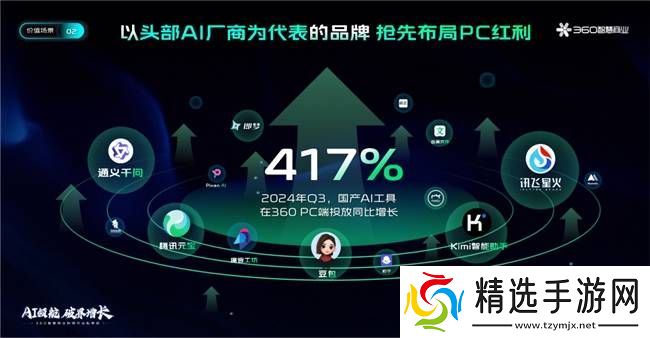 360智慧商业全国科技行业负责人李晶晶在会上分享了AI时代PC端释放的新质营销力。她提到,当前AI浪潮正在席卷科技行业,消费电子与B2B领域都迎来了重大变革。政策红利与AI技术的共振正在重塑消费电子市场的格局,PC端凭借与AI的完美适配,重新成为营销价值的高地,成为流量、需求和决策的主场。360智慧商业通过“AI+PC”生态破局,携手头部AI厂商打造多元增长场域。数据显示,2024年第三季度,国产AI工具在360 PC端的投放激增了417%,赋能品牌抢占用户心智高地。