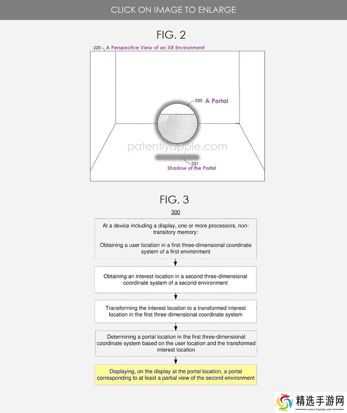 除了重影补偿,苹果的另一项 HMD 专利聚焦于“动态门户”(Dynamic Portals)技术。该技术允许设备在不同三维环境中切换视角,通过获取用户在第一环境中的位置和第二环境中的兴趣点,计算并显示一个门户窗口,使用户能部分查看第二环境。
