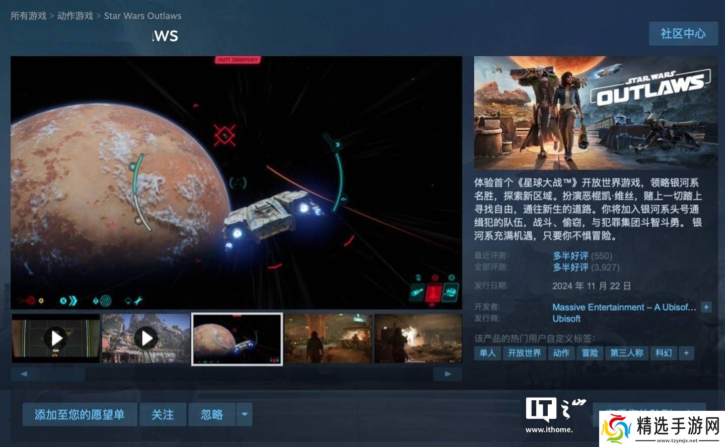 回顾《星球大战:亡命之徒》的发布历程,该游戏最初于2024年8月30日成功登陆了PS5、XSX|S以及PC平台,随后在11月22日正式进驻Steam平台,售价从298元起。截至目前,该游戏在Steam平台上的好评率高达73%,获得了“多半好评”的评价。
