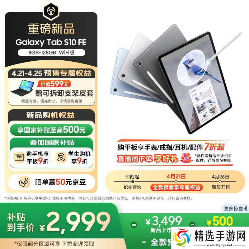 本站 4 月 18 日消息,三星 Galaxy Tab S10 FE 系列平板国行版将于 4 月 21 日开售,该产品搭载 Exynos 1580 芯片,售价 3499 元起,国补价 2999 元起。