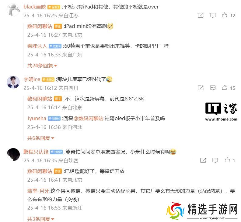 博主还在评论区回复了部分网友的问题:针对平板只有iPad和其他的言论,博主回复“iPad mini没有高刷”;针对新平板的屏幕是否为旧款屏幕,博主表示“不,这次是新屏幕,前代是 8.8"2.5K”。