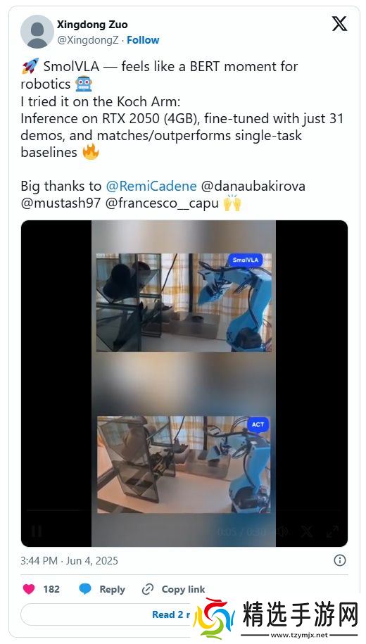 SmolVLA 已可在 Hugging Face 官方网站上下载。已经有用户在社交平台 X 上声称,他们利用该模型控制了第三方机械臂。