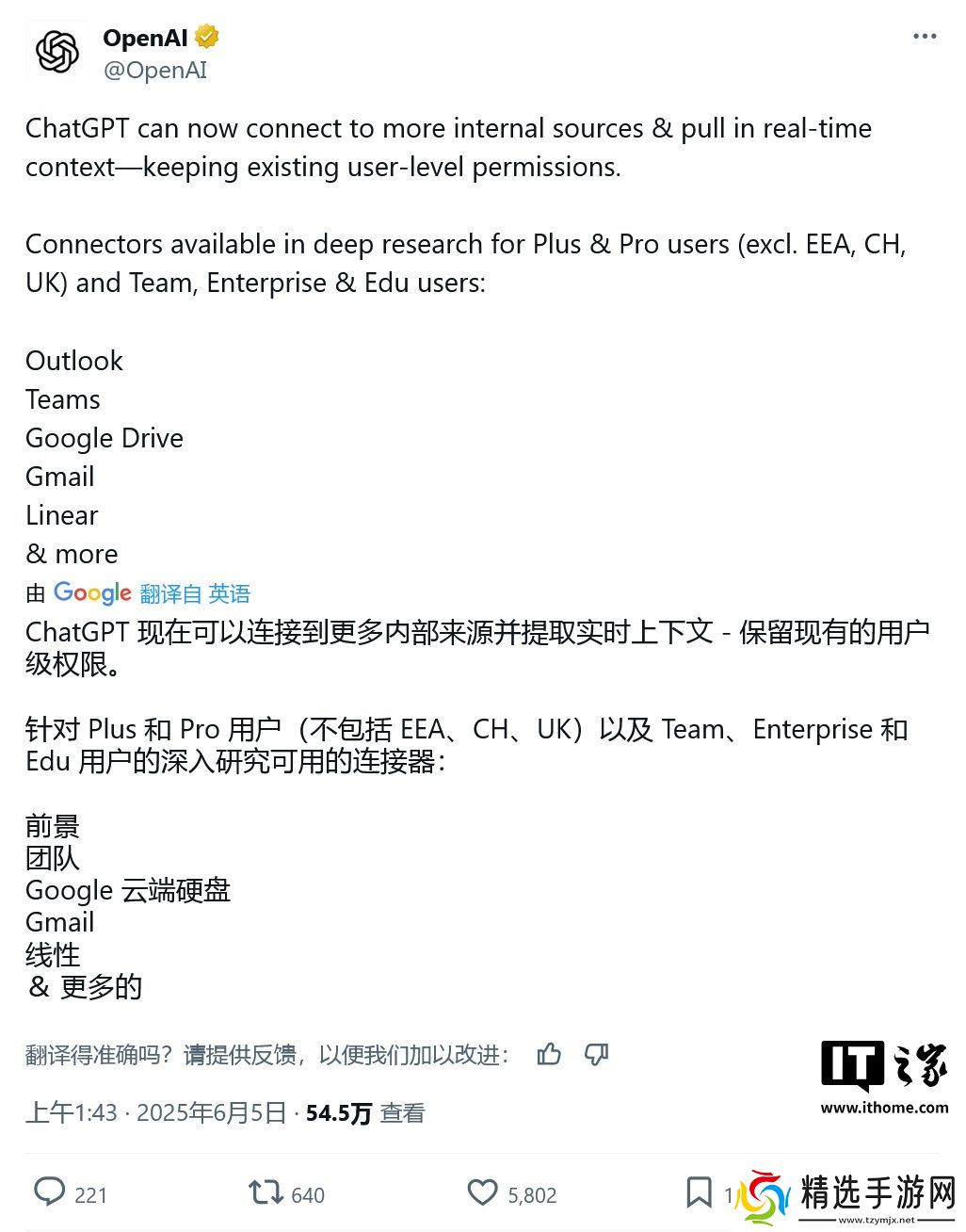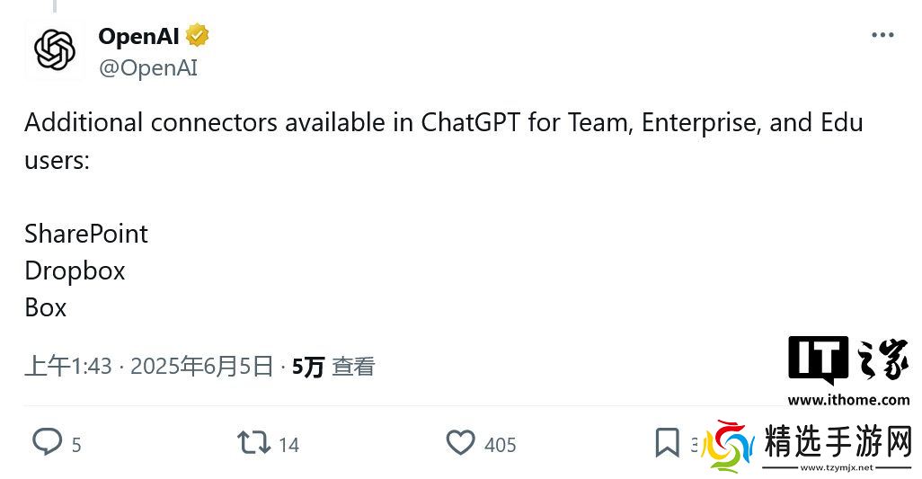 本站 6 月 5 日消息,科技媒体 9to5Mac 昨日(6 月 4 日)发布博文,报道称 OpenAI 公司重点服务于团队和小型企业,全力推动 ChatGPT 转型为真正的生产力助手。