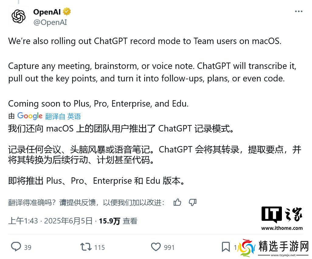 OpenAI 公司宣布自昨日开始,ChatGPT Team、Enterprise 和 Edu 用户在使用 Mac 版 ChatGPT 应用时,将看到提示工具旁新增的“录音”(Record)按钮。本站附上截图如下: