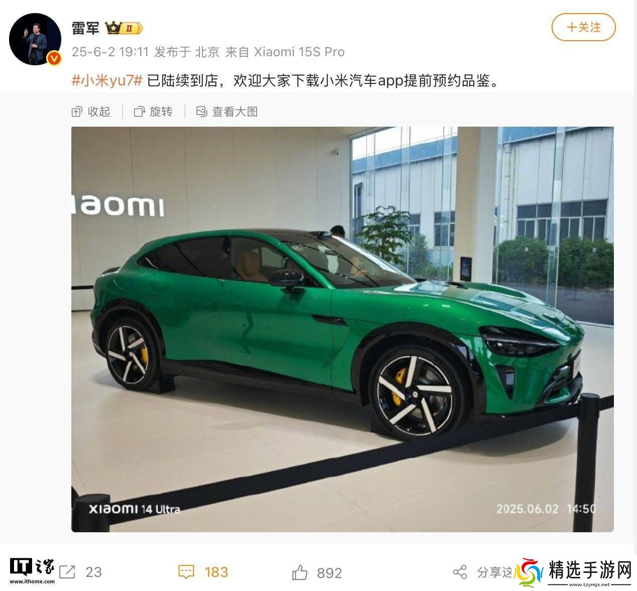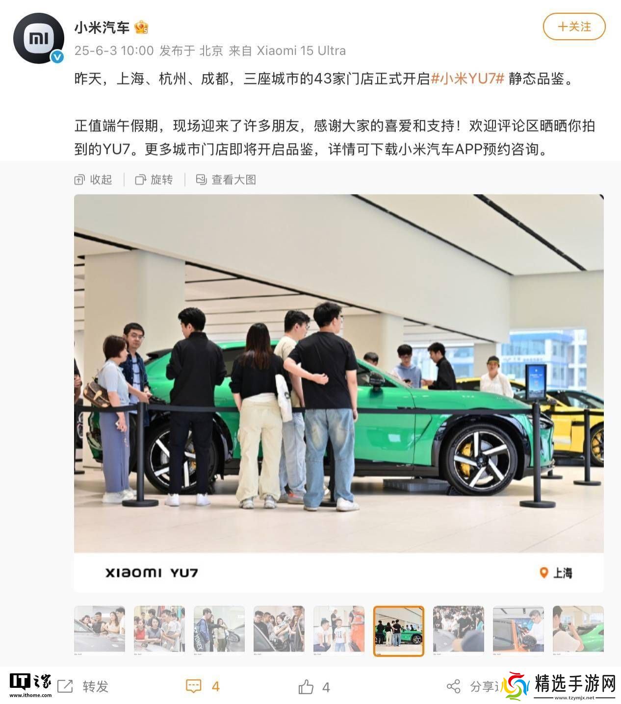 小米创始人雷军也在其个人微博上透露,YU7车型已陆续到店。他预计,近期将有更多城市的门店迎来YU7展车,预计到本月末,全国将有92座城市能够体验到这款新车型。
