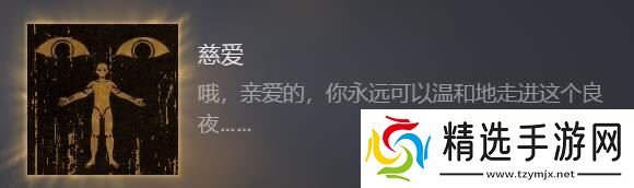 《苏丹的游戏》中的特殊成就的数量是非常多的,慈爱就是其中完成难度非常大的一个成就,“哦,亲爱的,你永远可以温和地走进这个良夜……”,想要做这个成就可以打正常的密教恶神线,无论有没有通过三次质疑看到真正神面,在恶之华事件结束后都会揭晓神面。