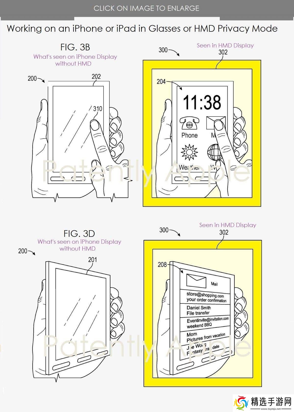专利还揭示了更多关于这一技术的细节和应用场景。在图示(FIGS 3B)中,一款结合了部分透明显示屏与虚拟对象的头戴系统,使用户能够同时看到真实场景与设备(如iPhone或iPad)上的内容。这种设计不仅提升了隐私保护,还为用户带来了更加沉浸式的体验。