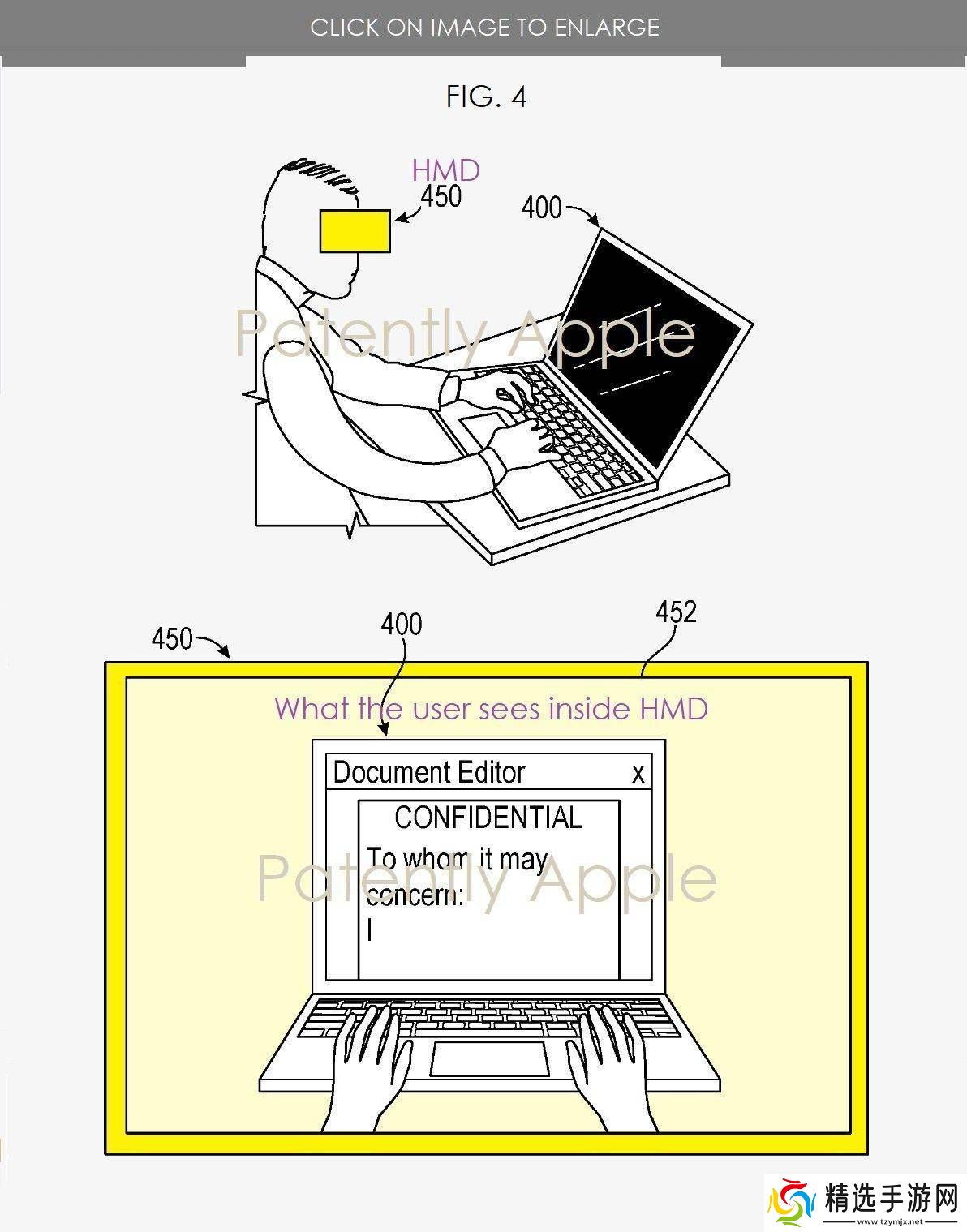 专利图示(FIG. 4)生动地展示了这一技术的实际应用场景。当用户佩戴上头戴设备后,可以在MacBook的屏幕上查看机密文档,而这些文档内容仅在头戴设备的显示屏上可见,外部人员无法窥视到任何信息。