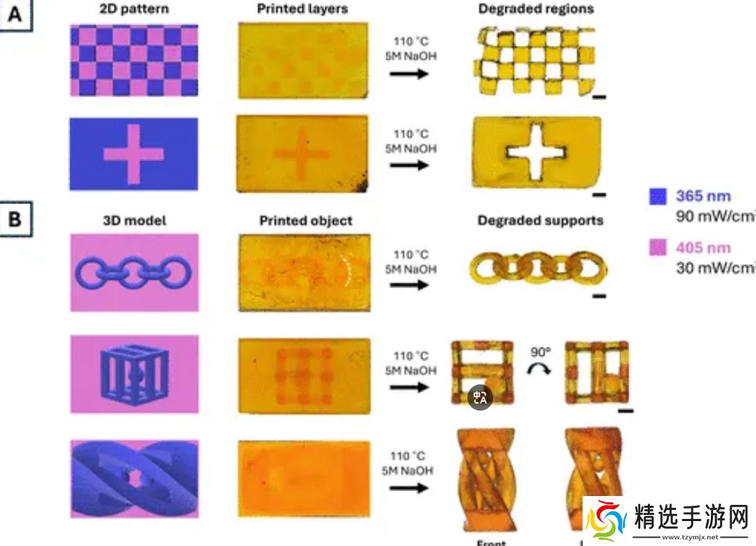 当紫外线聚焦到树脂上时,会形成固体永久结构,可以用于正在打印的主要物体。当可见光照射到相同的树脂上时,会形成另一种固体材料,当将其放入氢氧化钠溶液中时,15 分钟内就会溶解,该材料因此可以成为打印支撑结构的理想选择。