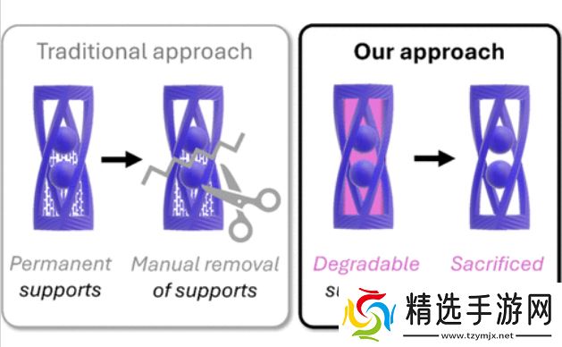 为了展示该系统的运行效果,研究团队制作了一些用其他方式无法打印的物体。例如,他们成功打印了一个悬浮在笼子中的球,支撑材料溶解后,该球就能在笼子中自由移动。他们还制作了一个连环锁和棋盘图案。