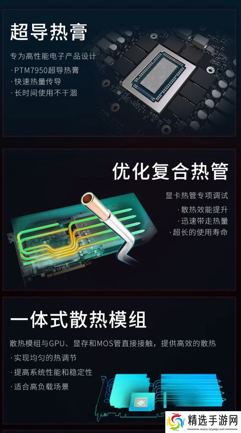 散热方面,该显卡采用复合式热管设计,可将热量扩散至整个散热模组,其 GPU 核心接触面采用霍尼韦尔 PTM7950 相变片,凭借其材料特性,可实现更高的导热效能,带来更长的寿命和更强的可靠性。