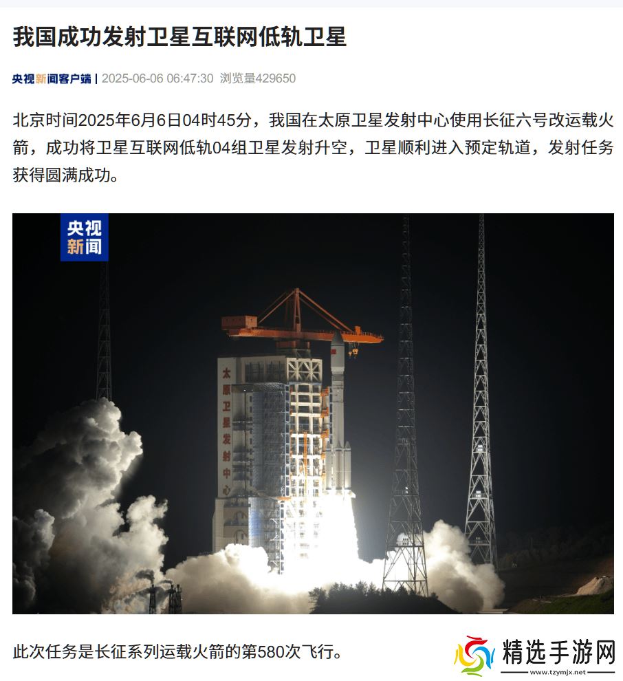 在宁静的黎明时分,我国航天事业再次迎来辉煌时刻。6月6日凌晨4点45分,太原卫星发射中心见证了长征六号改运载火箭的壮丽升空,成功将一组低轨卫星送入浩瀚的太空。此次发射标志着长征系列运载火箭的第580次飞行任务**成功,卫星顺利进入预定轨道。