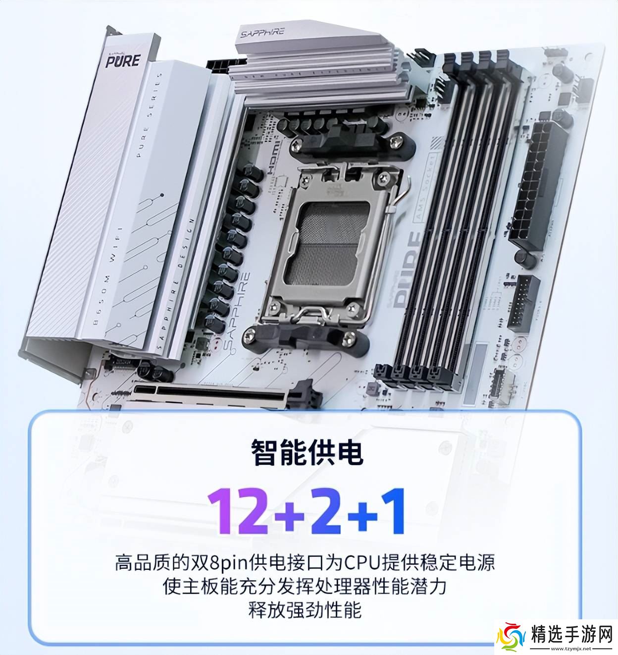 这款主板采用了蓝宝石标志性的极地纯白设计风格,整体色调简洁明快,线条流畅,元素布局考究,无论是单独展示还是作为白色主题机箱的一部分,都能展现出令人赞叹的科技美学,充分满足了现代玩家对于主机个性化和高颜值的追求。作为AMD锐龙9000系列处理器的理想伴侣,PURE极地B650MWIFI主板全面兼容AM5插槽,搭载了强大的12+2+1路数字供电模组和双8PIN CPU供电接口,能够轻松应对包括9950X、9950X3D等在内的AMD锐龙7000、8000、9000系列处理器的性能需求,实现极限性能的稳定释放,超频能力更是达到了新的高度。