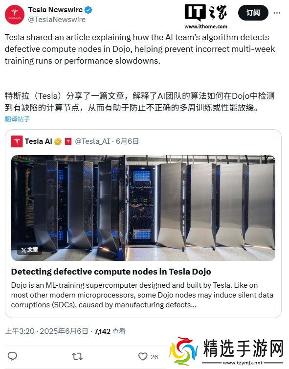 本站 6 月 7 日消息,特斯拉昨日发文,向用户介绍了其百万核心级 Dojo 超算系统的故障核心检测技术。