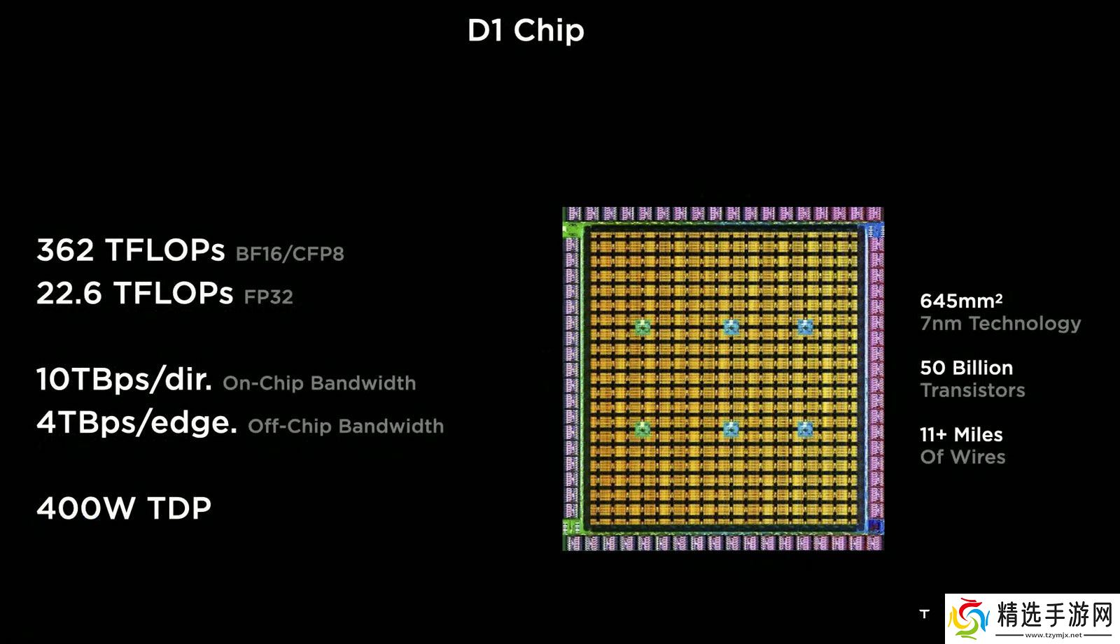 特斯拉将晶圆级 Dojo 处理器称为“训练模块”,每个模块包含 25 个 645mm² 的 D1 Chip,采用台积电 InFO_SoW 技术封装,集成 354 个定制的 64 位 RISC-V 核心(含 1.25MB SRAM 用于存储数据和指令),以 5×5 集群排列并通过机械网络互联,可提供 10TB/s 带宽。每个 D1 还支持 4TB/s 片外带宽,因此单个“训练模块”总共具备 8,850 核心,支持 8/16/32/64 位整数及多种数据格式。