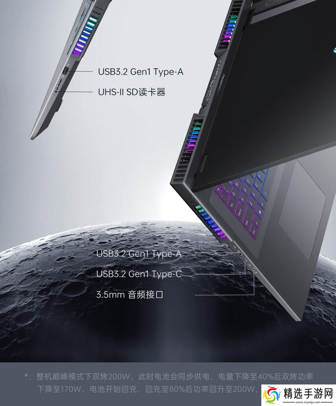其他方面,该机配备 4 扬声器、99Wh 电池、单键 RGB 键盘、光幕 RGB 灯效系统(整机 154 颗 RGB 灯珠)、双内存槽(最大 96GB)、双 M.2 硬盘位(支持 PCIe 5.0)、高清摄像头,支持 WiFi 7 及蓝牙 5.4,提供了 USB-C*2、USB-A*3、千兆网口、HDMI 2.1、3.5mm 音频接口、SD 读卡器。