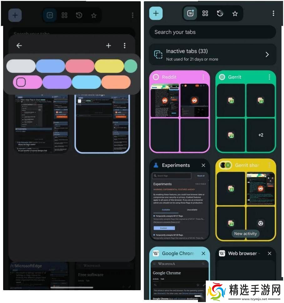 标签组(tab group)的用户界面同样迎来了变化。原本采用彩色小圆点显示的设计,在新版中变得更加鲜艳夺目。所选颜色将覆盖整个标签组卡片,使得用户能够更直观地识别和管理不同的标签组。