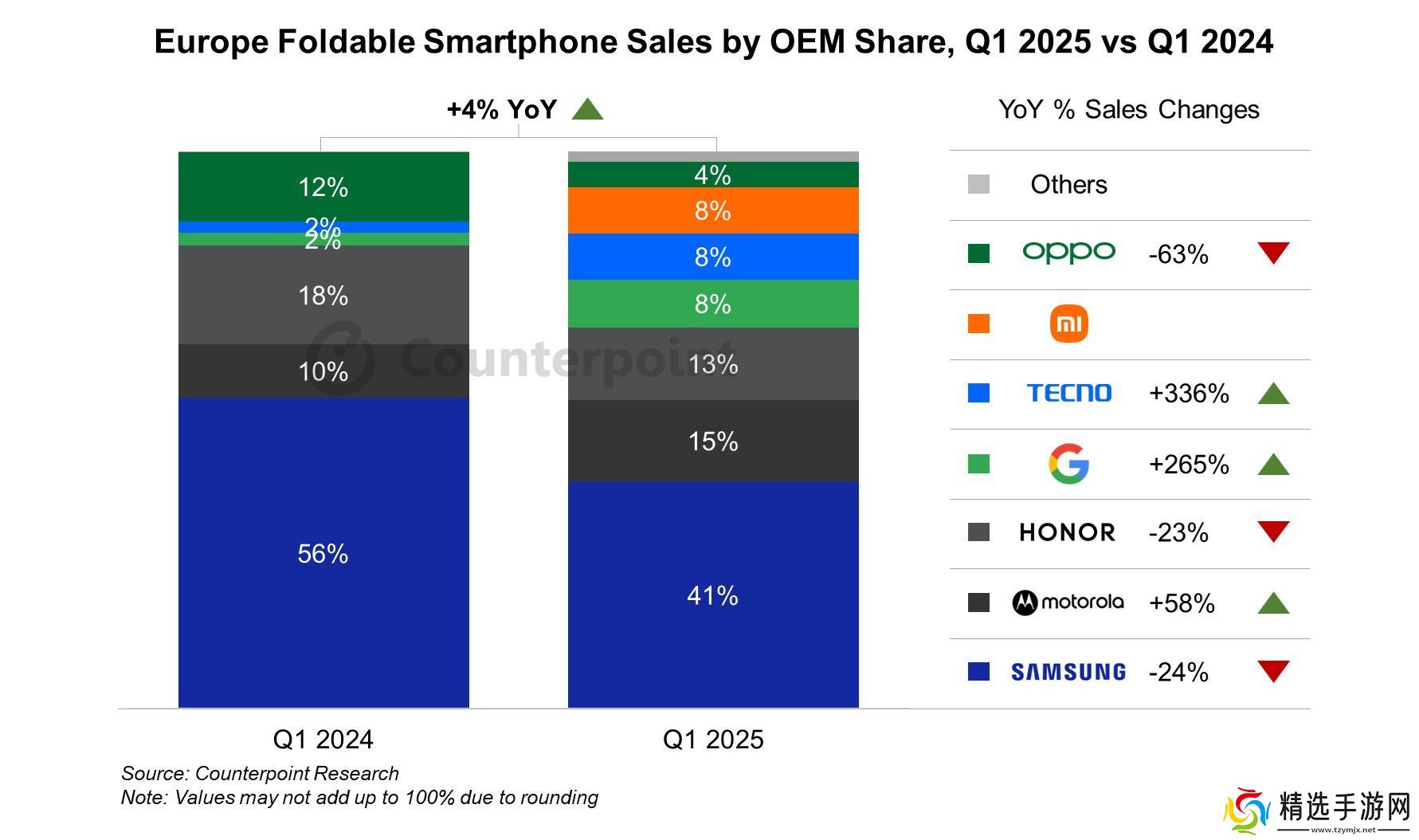 本站 6 月 10 日消息,根据市场调查机构 CounterPoint Research 昨日(6 月 9 日)发布的博文,报道称在 2025 年第 1 季度,欧洲折叠屏手机销量在智能手机总销量的占比为 1.5%,同比增长仅 4%,显示其仍是一个小众市场。