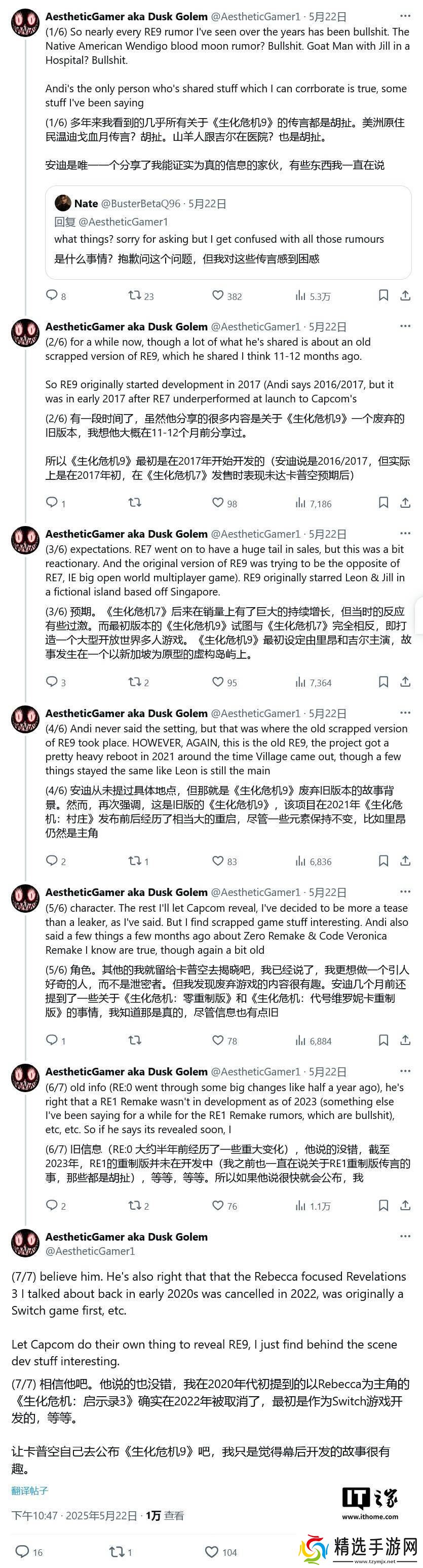 近日,有消息称,《生化危机》系列的最新作品《生化危机9》的开发历程经历了重大转折。据消息源Dusk Golem在X平台上的系列推文透露,与《生化危机7》的线性单人游戏模式截然不同,《生化危机9》最初被设计为“大型开放世界多人游戏”。