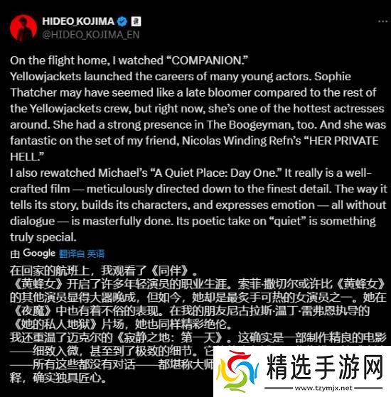 知名游戏制作人小岛秀夫近期以影评人的独特视角,分享了他对几部电影的深刻见解。在他的影评中,不仅涉及了《完美伴侣》这部情感丰富的影片,还提及了备受瞩目的《寂静之地:入侵日》。