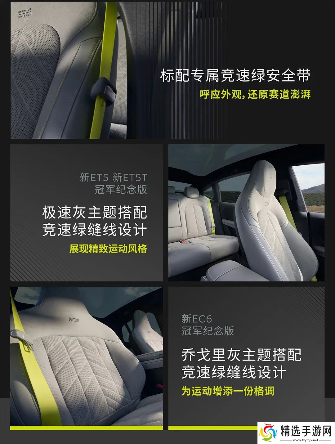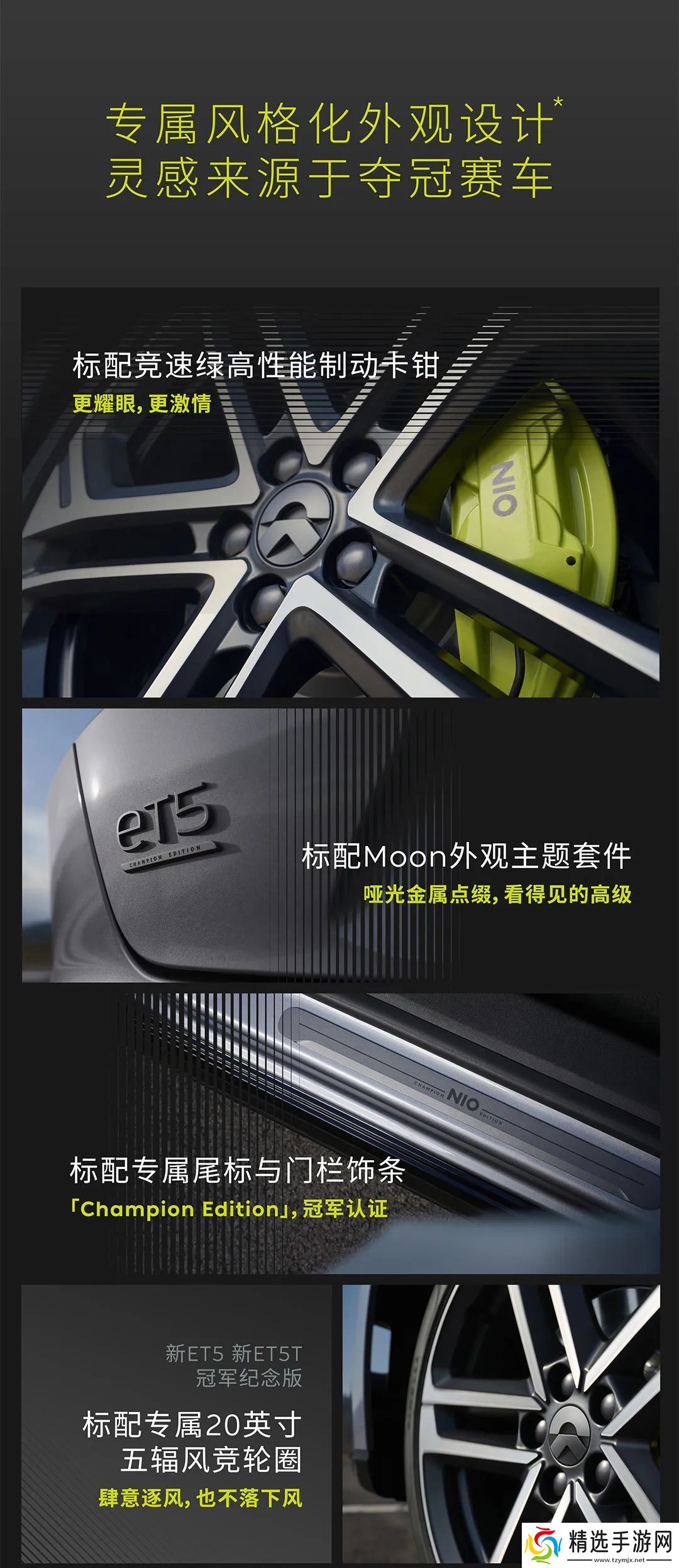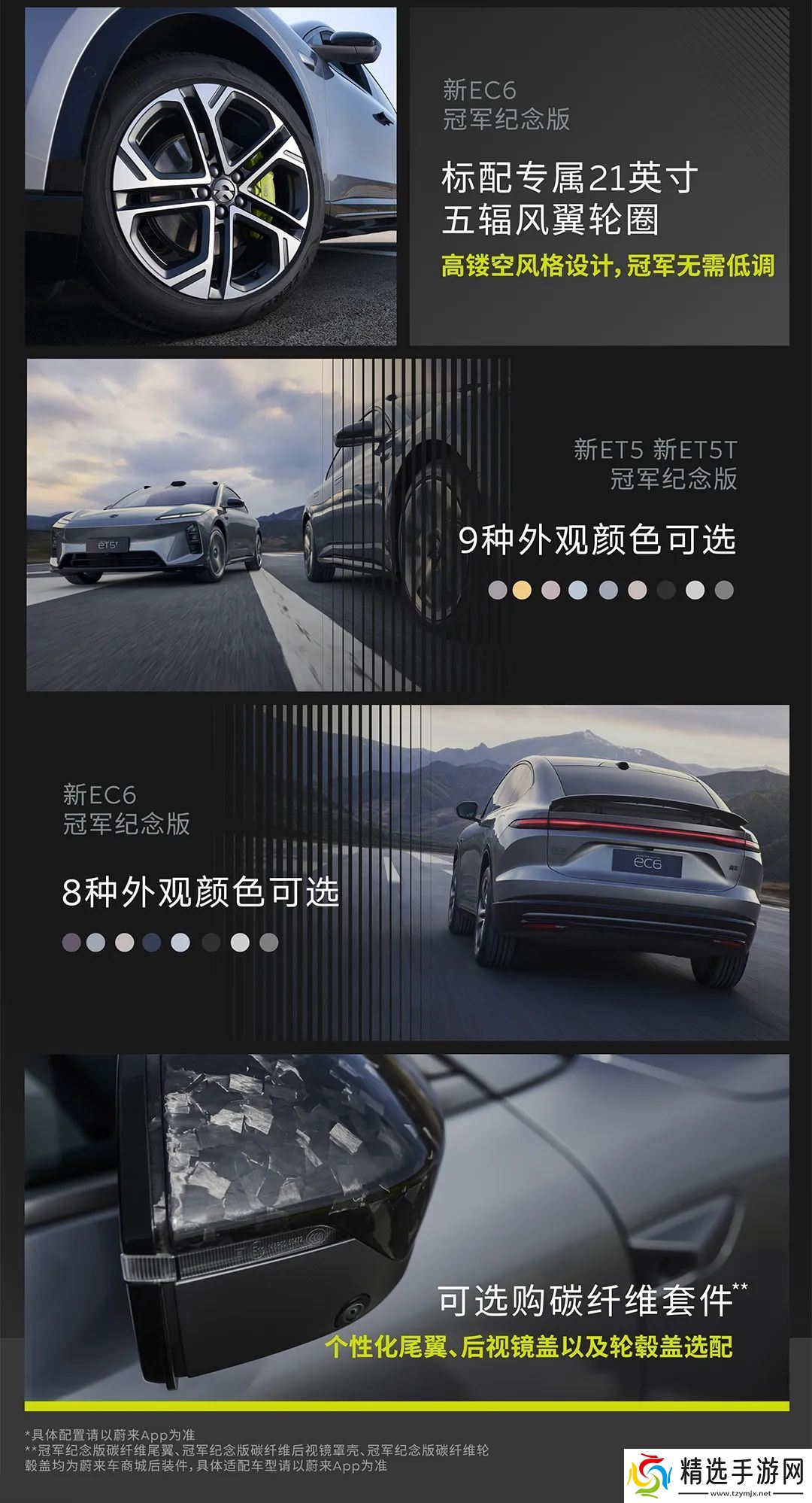 这三款新车采用了专属风格的外观设计,以夺冠赛车为灵感,标配竞速绿高性能制动卡钳、Moon 哑光金属主题套件、专属尾标与门栏饰条、20 英寸五辐风竞轮圈(ET5 / ET5T)或 21 英寸五辐风翼轮圈(EC6),还可选购碳纤维套件(个性化尾翼、后视镜盖、轮毂盖)