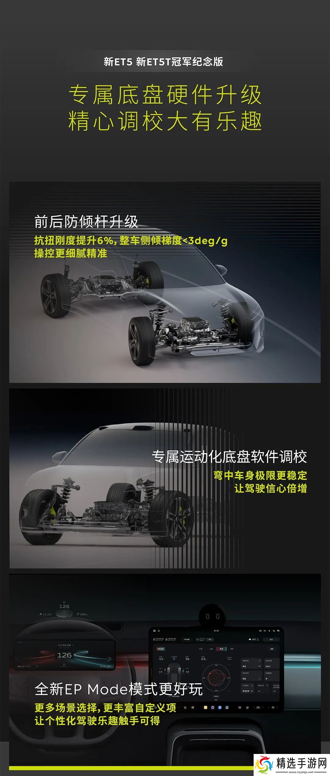驾驶层面,新 ET5 / ET5T 拥有专属底盘硬件升级,通过前后防倾杆升级实现抗扭刚度提升 6%,使整车侧倾梯度小于 3deg / g;采用专属运动化底盘软件调校,并配有全新的 EP Mode,带来更多场景选择和更丰富的自定义项。