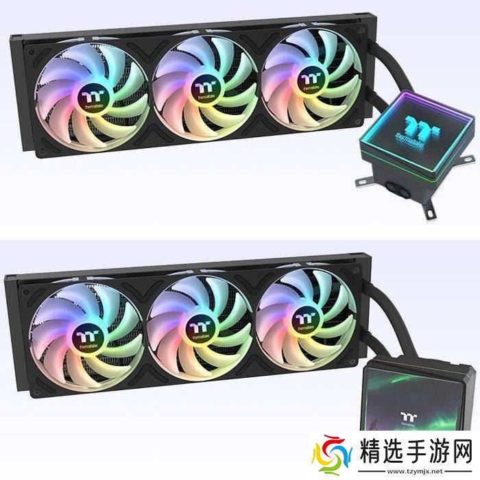 曜越并未止步于此,他们还推出了TH360 V3 ARGB Sync 和 TH360 V3 Ultra ARGB Sync 两款散热器。前者冷头采用无限镜曜越标志灯效,简约而不失科技感;后者则升级为单块3.95英寸方形屏幕,分辨率同样为720×720,为用户提供了更多的个性化选择。