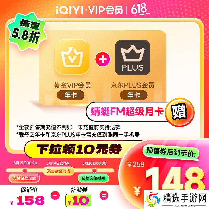 爱奇艺黄金会员年卡 + 京东 PLUS 年卡日常售价 258 元,现 618 大促直降至 158 元,叠加 10 元京东补贴券,到手价为 148 元: