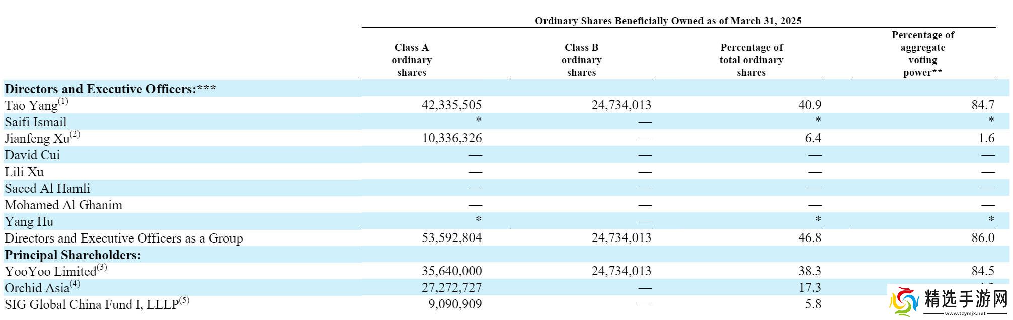 具体来看,Yalla Group的创始人、董事长兼首席执行官杨涛持有公司40.9%的股份,并享有高达84.7%的投票权,显示出其在公司治理中的绝对主导地位。公司首席运营官Jianfeng Xu则持有6.4%的股份,拥有1.6%的投票权。Orchid Asia和SIG Global China Fund I, LLLP分别持有17.3%和5.8%的股份,对应的投票权分别为4.3%和1.4%。