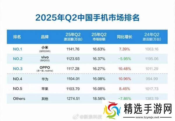 在最新的市场调研报告揭晓中,小米公司在2025年第二季度(覆盖第14至26周)的国内手机市场取得了显著成就,凭借16.63%的市场份额,成功登顶新机激活量榜首。这一季度,小米共激活了1141.76万台新手机,与去年同期相比,增长率达到了7.39%。紧随其后的是vivo、OPPO和华为,分列市场第二、第三和第四位。
