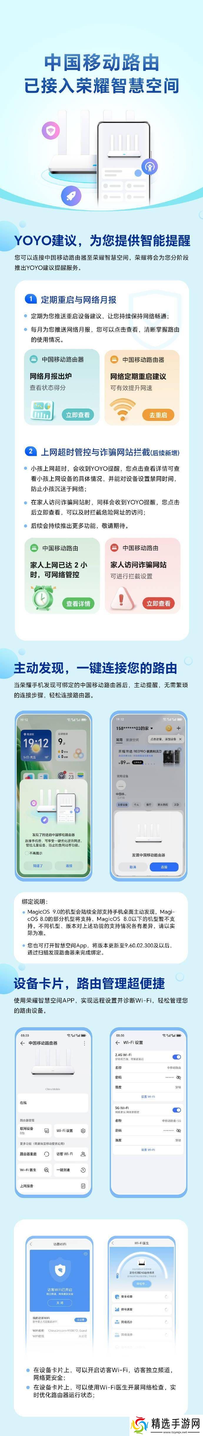 据荣耀智慧生活介绍,用户只需将中国移动路由器与荣耀智慧空间进行连接,即可享受到YOYO建议智能提醒服务。这一服务将分阶段推出,包括定期推送的网络重启与月度报告、上网时长智能管控以及诈骗网站拦截等功能。这些贴心提醒和智能管控措施,旨在帮助用户更好地管理家庭网络,确保网络安全和高效运行。
