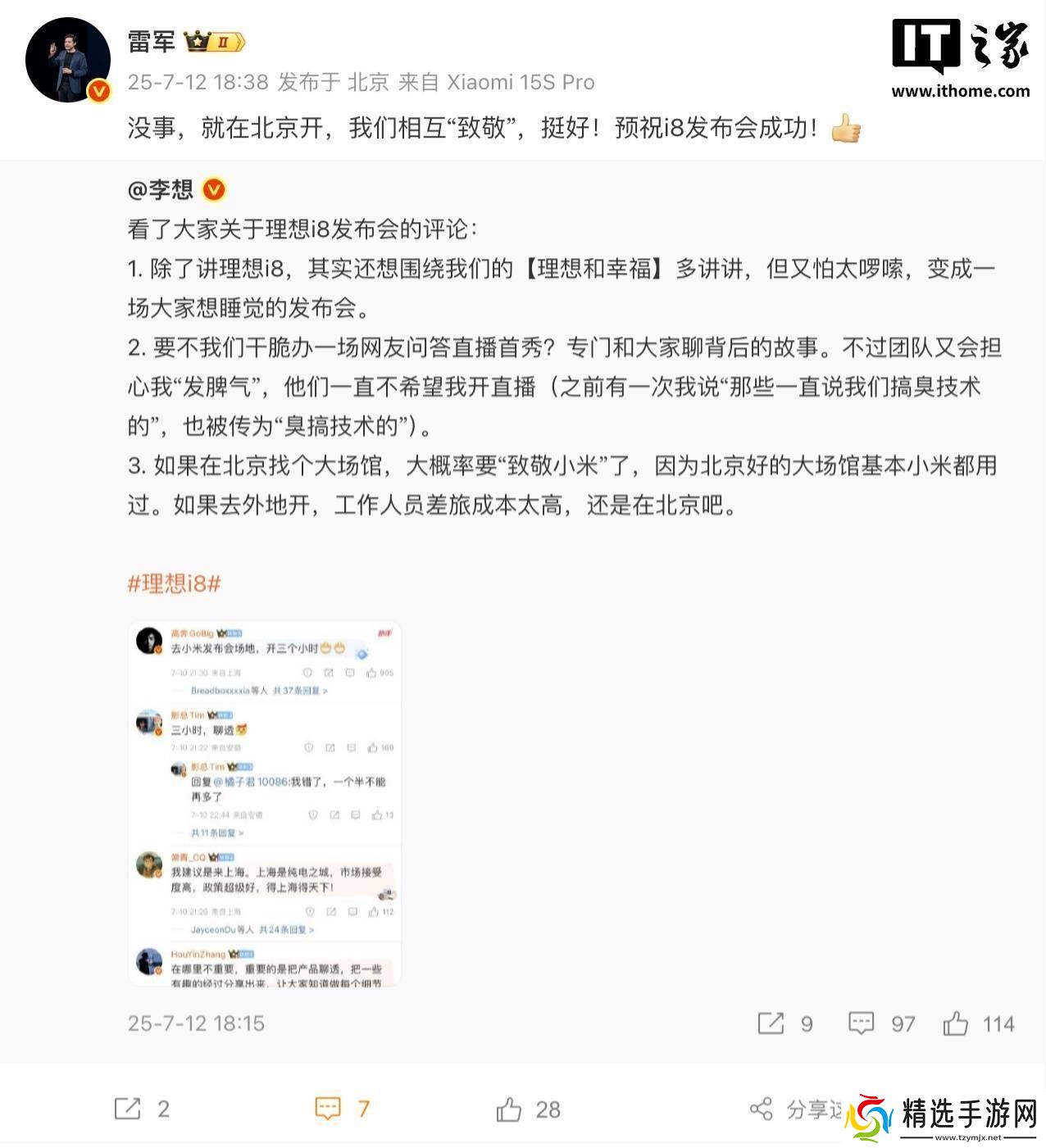 对此,小米CEO雷军大方回应,表示不介意理想汽车在北京举办发布会,并风趣地提出“相互致敬”,预祝理想i8发布会**成功。