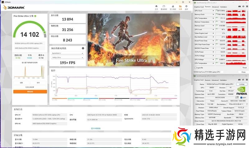 在3DMark测试中,RTX 5090 Laptop GPU的表现同样抢眼。在2K分辨率的3DMark Fire Strike Extreme测试中,图形分数达到了29144分;在4K分辨率的3DMark Fire Strike Ultra测试中,图形分数也有13894分。而在2K分辨率的3DMark Time Spy测试中,图形分数更是高达22092分,充分展示了其强大的性能。