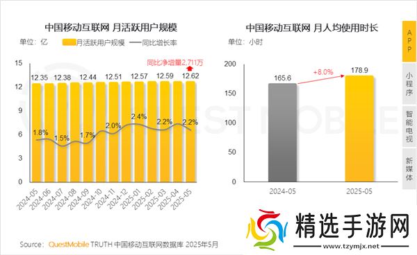 • 本站 7 月 15 日消息,分析公司 QuestMobile 发文,透露截至今年 5 月,全国移动互联网月活跃用户规模达 12.62 亿,同比增长 2.2%。全网月人均使用时长同比增长 8%,达 178.9 小时。