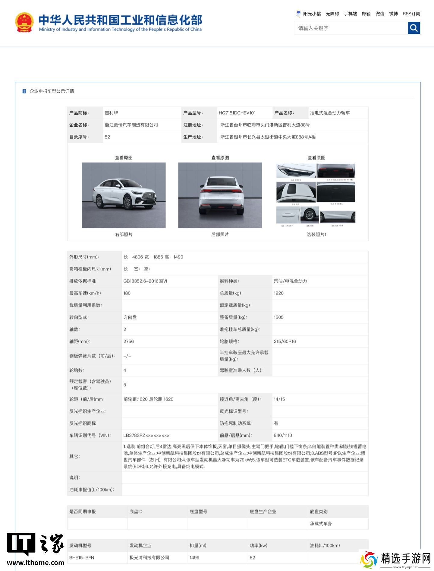 本站 7 月 16 日消息,工信部今天发布了第 397 批《道路机动车辆生产企业及产品公告》,本站从其中发现了吉利全新车型 —— 银河系列的插混轿车星耀 6。