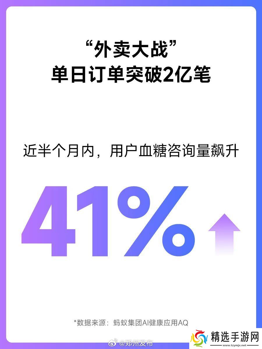 本站 7 月 17 日消息,据“郑州发布”今日消息,外卖单日订单突破 2 亿“天量”,多家平台战报连连,而蚂蚁 AI 健康管家 AQ 却发布警报:数据显示,最近半个月,血糖相关咨询量飙升 41%。