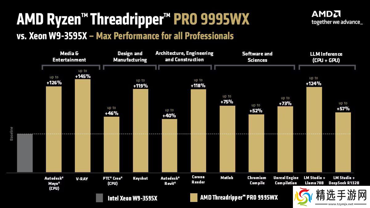 AMD 还公布了新的基准测试数据,将 9995WX 与 Intel 的 Xeon W9-3595X 进行了比较,AMD 宣称,根据不同的测试,性能优于后者 40% 至 145%。