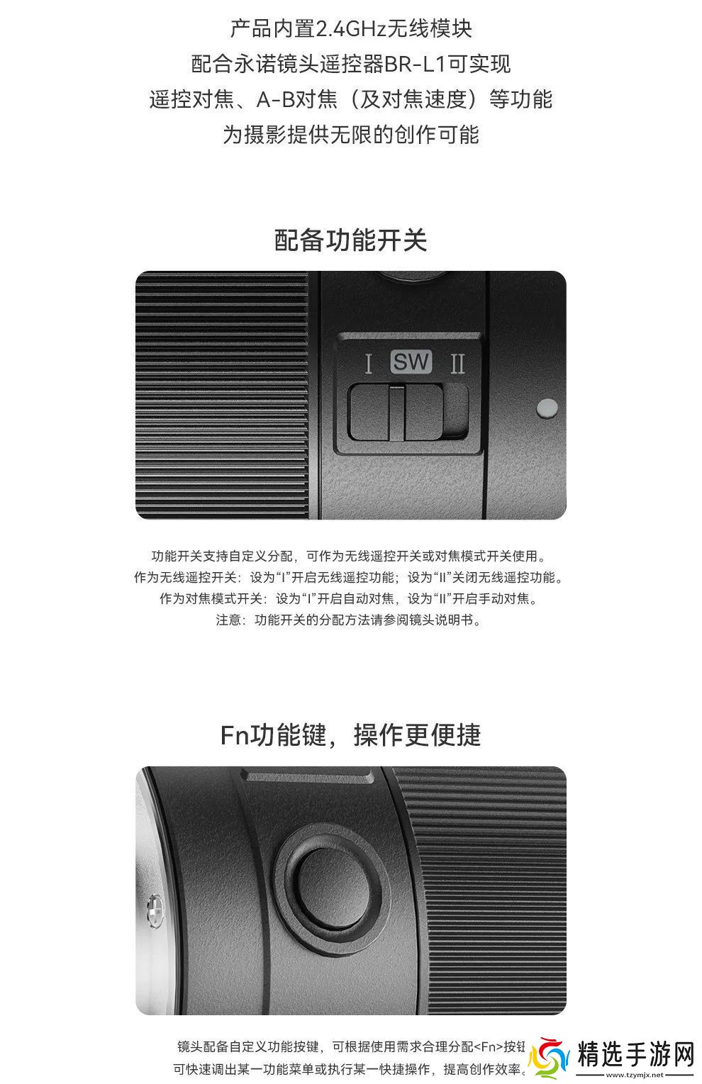 永诺 50mm F1.8S DA 提供了黑白双色可选,适配索尼 E 口的 APS-C 镜头,滤镜直径 58mm,支持自动对焦;永诺 YN35mm F1.8S 同样适配索尼 E 口和 APS-C 画幅,等效约 52mm,重约 179g,还支持无线遥控功能。