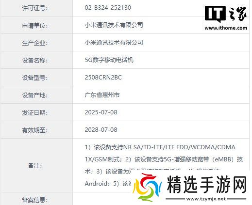 本站 7 月 18 日消息,一款型号为 2508CRN2BC 的小米新机于 7 月 8 日在工信部入网,预计为 REDMI 15C 手机,其主要参数此前已经海外曝光。