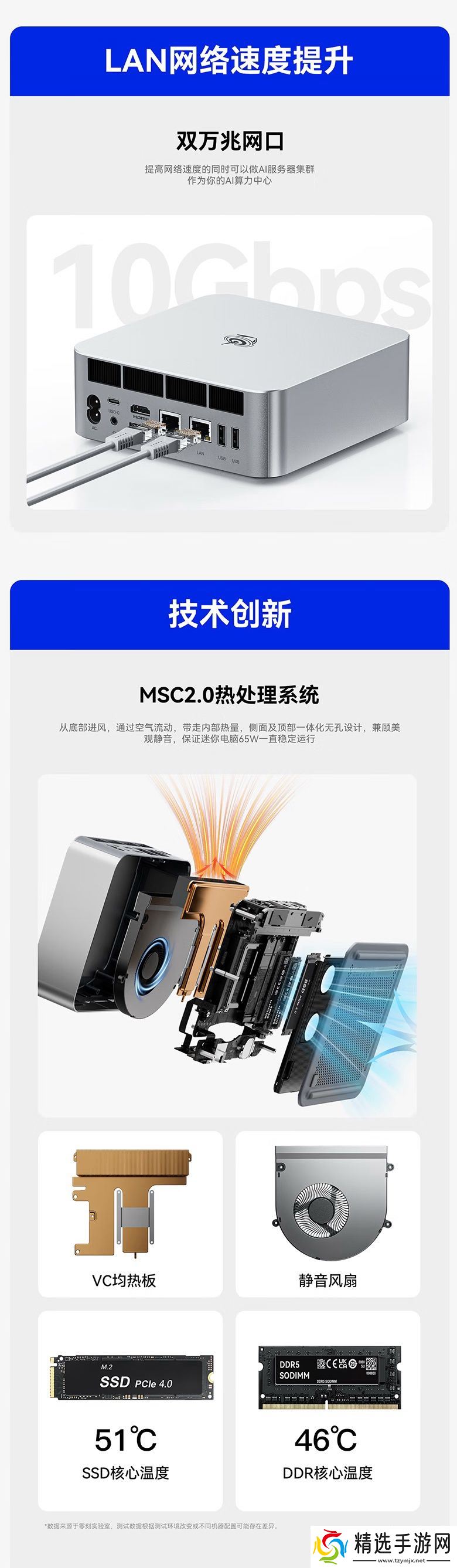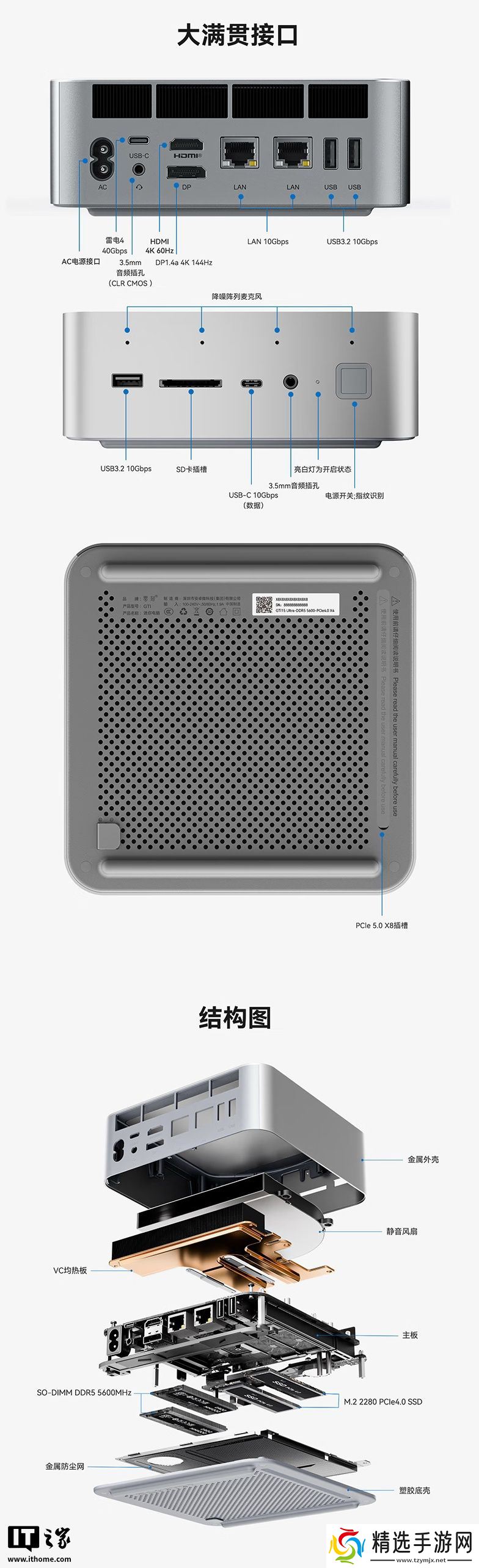 背面:AC-in 电源接口、1× 雷电 4 40Gbps Type-C、1× 3.5mm 音频插孔、1×HDMI 2.1 TMDS、1× DP 1.4a、2× 10GbE RJ45、2× USB-A 10Gbps;
