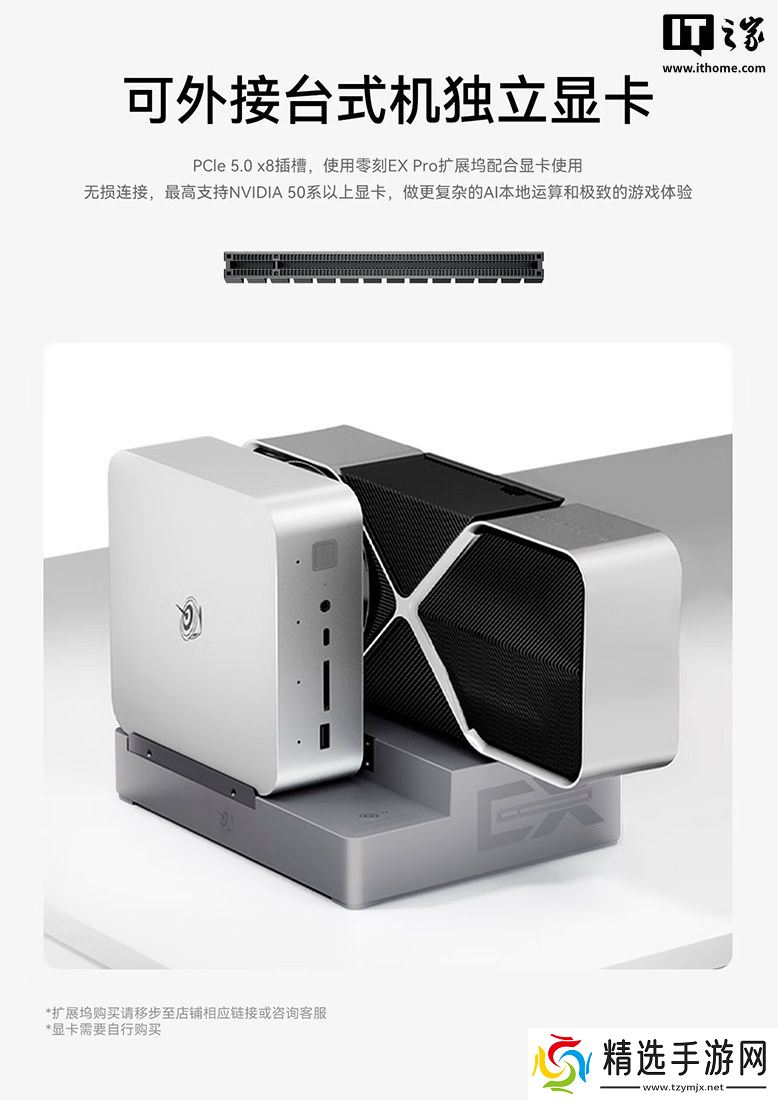 该机整体造型简洁,采用冰霜银配色,尺寸为 158×158×55.8mm,体积为 1.4L,背部拥有双万兆网口,底部提供可配合本家 EX Pro 显卡扩展坞使用的 PCIe × 8 插槽。