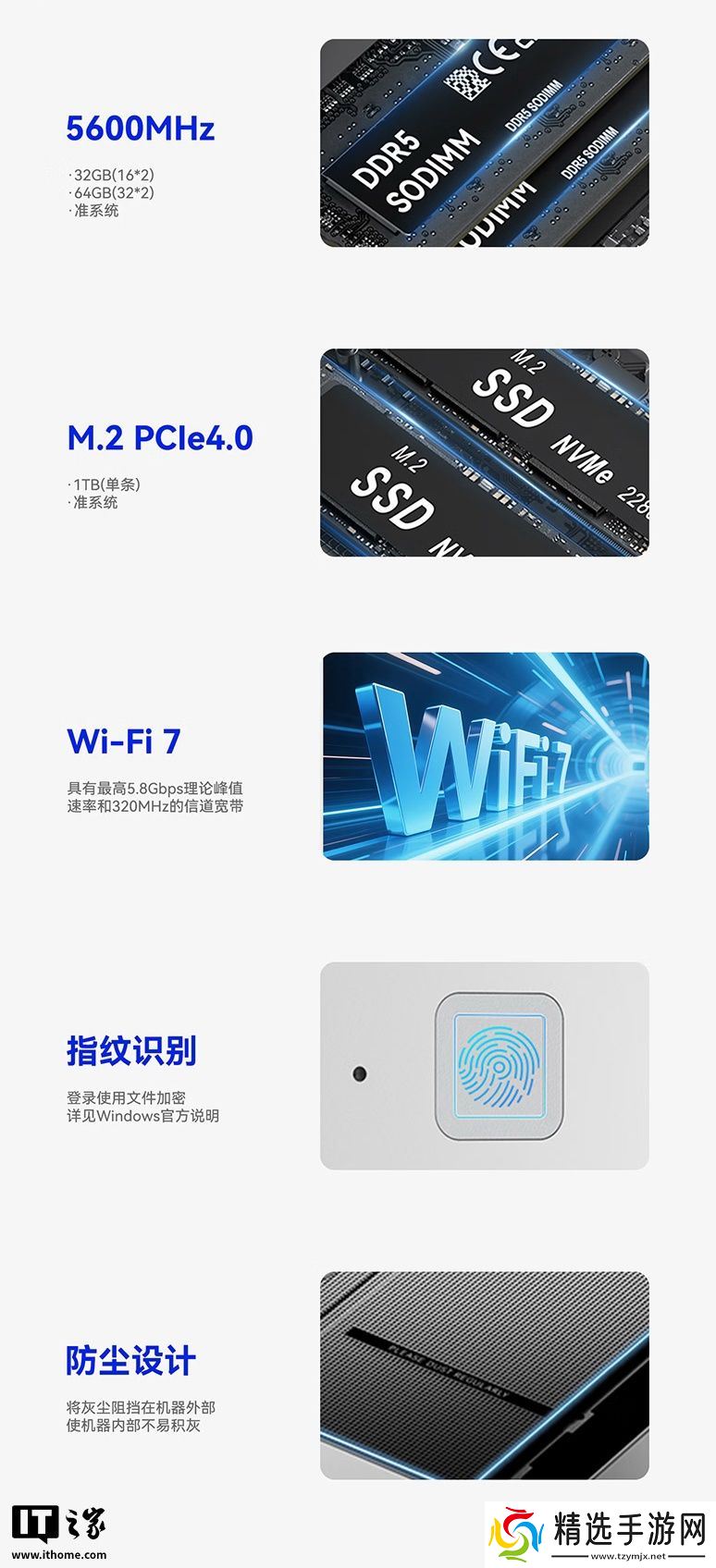 其他方面,该机搭载英特尔 BE200 Wi-Fi 7 & BT 5.4 无线网卡,内置麦克风拾音降噪芯片和 DSP + 功放扬声系统,电源按钮嵌入指纹识别模块。