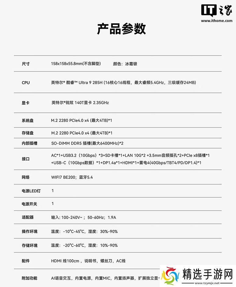该机搭载 16 核心 16 线程英特尔酷睿 Ultra 9 285H 处理器,提供 2 条 DDR5 SODIMM 内存插槽(本站注:支持 6400MT/s,预装 5600MT/s)和 2 个 M.2 2280 PCIe 4.0×4 盘位,内置 145W 电源,搭载支持 65W 稳定性能释放的 MSC 2.0 均热板 + 静音风扇散热系统。
